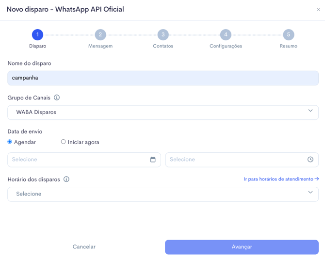 Agendamento: Defina se o disparo será enviado imediatamente ou em uma data/hora específica.