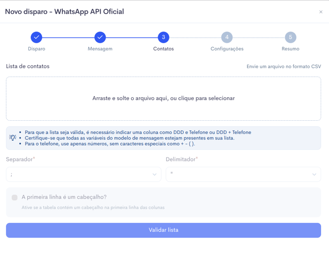 Faça o upload de um arquivo .CSV com os números válidos (ex: