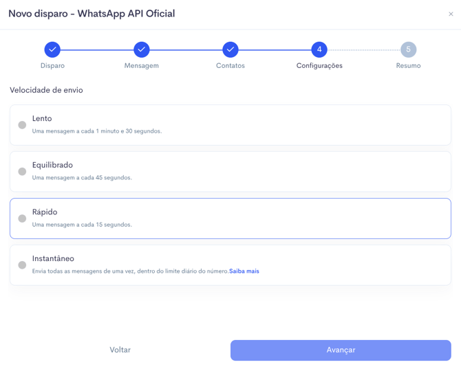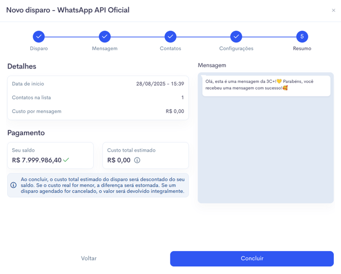 Ao confirmar, o disparo será iniciado imediatamente ou na data/hora definida.