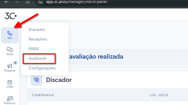 Para acessar os monitores e as avaliações realizadas pelo AuditorIA, basta clicar em "voz" (ícone de telefone) no menu lateral, e logo em seguida AuditorIA, como na imagem abaixo: