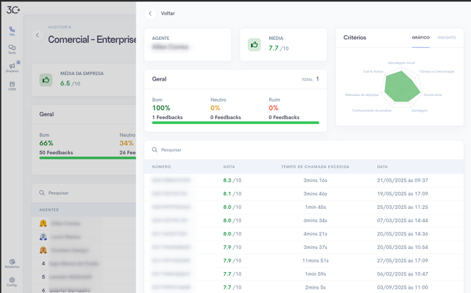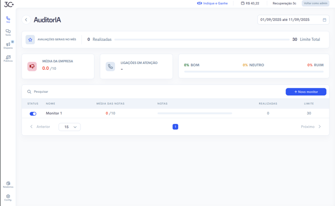 O AuditorIA é a ferramenta de acompanhamento da qualidade dos agentes. Permite criar monitores personalizados, definir critérios de avaliação e acompanhar as campanhas avaliadas automaticamente.