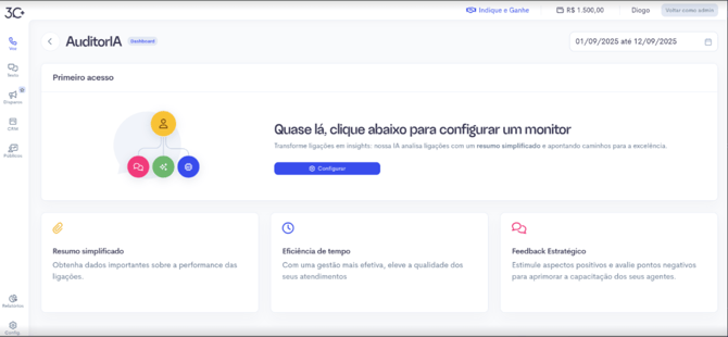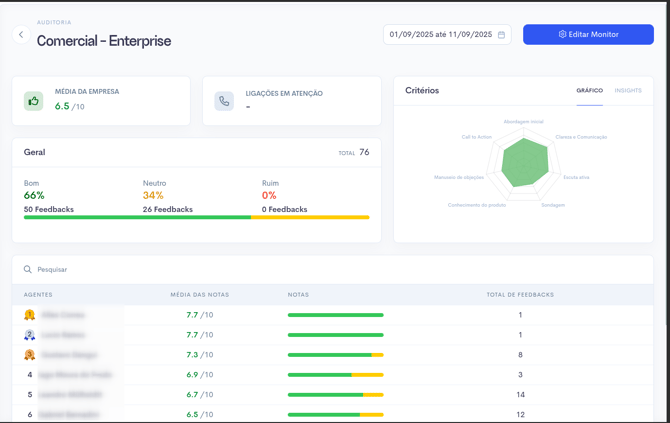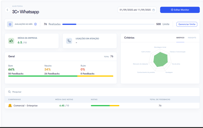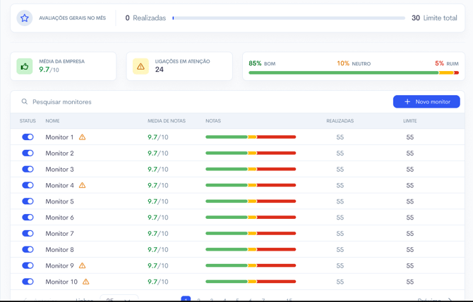 Após configurar o monitor, você será redirecionado para a dashboard, onde é possível visualizar todos os monitores ativos e as configurações gerais. Nela, você acompanha o total de ligações avaliadas, o limite configurado para cada monitor e uma visão macro da empresa, incluindo a média das notas e a distribuição percentual entre avaliações boas, neutras e ruins. Ao aplicar o filtro de datas, todas as métricas são ajustadas, permitindo analisar diferentes períodos com precisão.