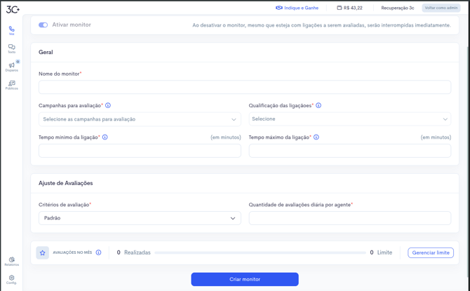 Importante lembrar que todas as avaliações são feitas de um dia para o outro, iniciando o processo às 00:01 do dia seguinte a configuração do monitor, as avaliações são feitas sempre do dia retroativo, ou seja, se no caso o monitor fora configurado dia 10/09/2025, ele iniciará as avaliações dia 11/09/2025, contabilizando as ligações do dia 10/09.