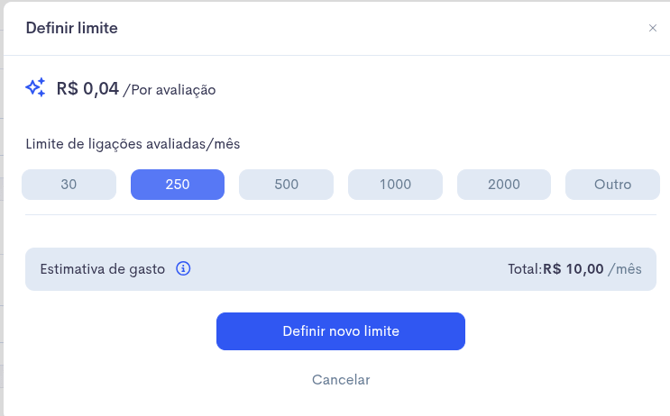 Nas configurações, é possível ainda configurar o limite de ligações que este monitor realizará por mês. Todos os monitores zeram as contas das ligações realizadas na virada de cada mês. Mesmo que um monitor utiliza o limite estabelecido, você pode a qualquer momento aumentar este limite. Ao selecionar os limites pré-setados, ou escolher um outro limite customizado, será mostrado em reais (R$) o valor que será cobrado.