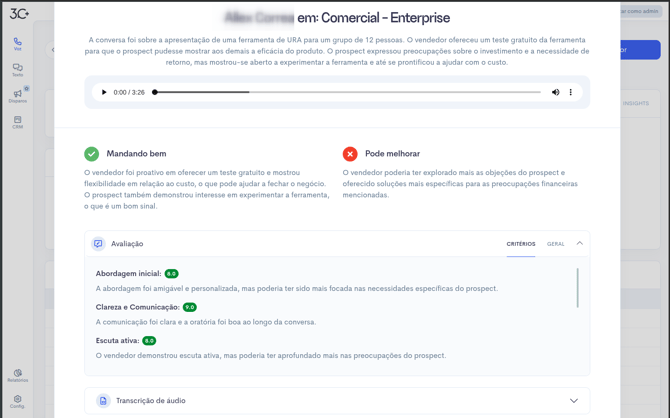 Ao clicar na ligação você terá acesso ao resumo do que foi abordado na ligação, a transcrição do áudio, reprodução do áudio, pontos positivos abordados pelo seu agente e também os pontos negativos.