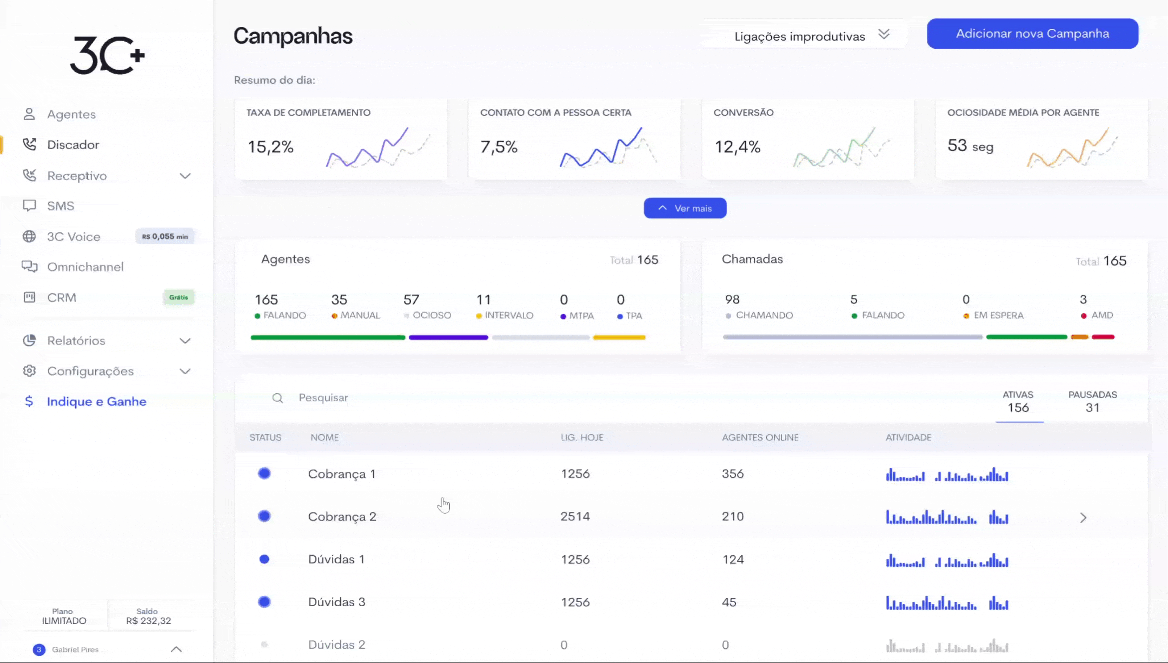 Para acessar a aba de renitência, é necessário ser um usuário Pro da 3C+. Após a verificação deste critério, acesse as configurações da sua campanha, onde encontrará a opção de renitência: